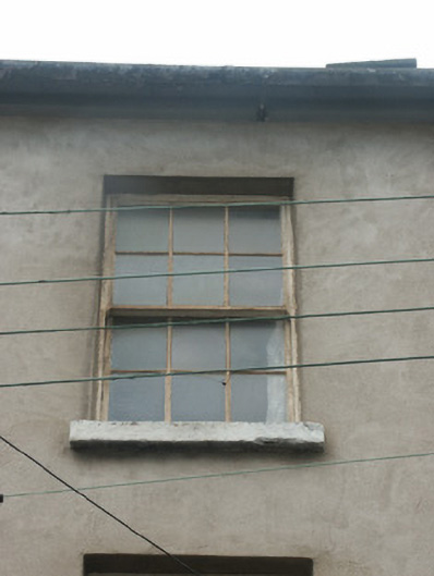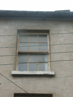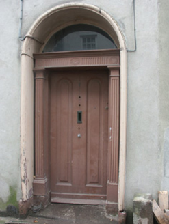 End-of-terrace two-bay three-storey house with dormer attic, c.1825, originally terraced with single-bay (single-bay deep) three-storey lower return to south-east. Now disused. One of a group of two. Pitched (shared) slate roof (hipped to return) with clay ridge tiles (terracotta ridge tiles to return), rendered chimney stacks having capping supporting terracotta pots, rooflight, and cast-iron rainwater goods on rendered eaves having iron ties. Rendered wall to front (north-west) elevation possibly replacement with rendered channelled pier to end, and roughcast walls to remainder. Square-headed window openings with cut-stone sills, and six-over-six timber sash windows having overlights to first floor (boarded-up to ground floor). Segmental-headed door opening with cut-granite or limestone step having cast-iron bootscraper, moulded rendered surround on cut-granite or limestone padstones, fluted timber pilaster doorcase on padstones supporting inscribed frieze, and timber panelled door having overlight. Interior with timber panelled reveals or shutters to window openings. Street fronted with concrete footpath to front.