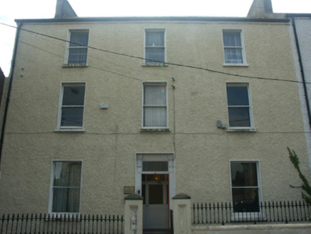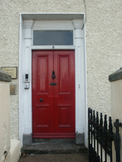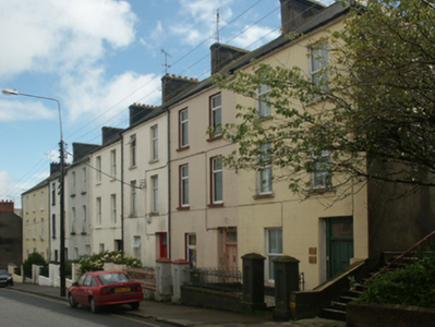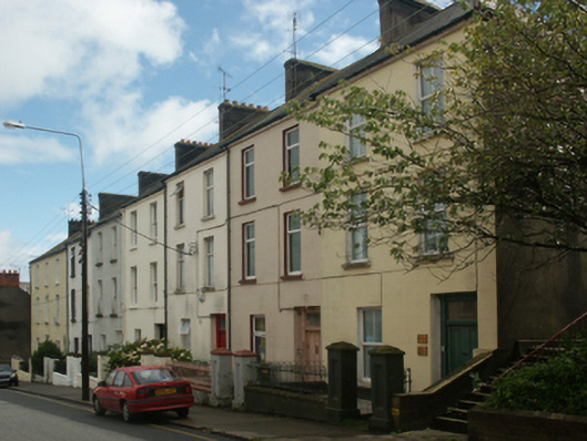 End-of-terrace three-bay three-storey house, built 1883. Now in use as offices. One of a terrace of four forming part of a group of seven. Pitched slate roof with clay ridge tiles, rendered chimney stacks, and replacement uPVC rainwater goods on rendered eaves retaining cast-iron downpipes. Roughcast walls. Square-headed window openings with cut-stone sills, and one-over-one timber sash windows. Square-headed door opening with cut-granite step, timber panelled (hollow) pilaster doorcase on cut-granite padstones, and timber panelled door having overlight (leading to square-headed internal door opening with glazed timber panelled door having sidelights on panelled risers, and overlight). Interior with timber panelled shutters to window openings. Set back from line of street with rendered boundary wall having cut-granite coping supporting iron railings incorporating cast-iron finials, rendered panelled piers having carved cut-granite capping, and iron gate incorporating cast-iron finials [VO].
