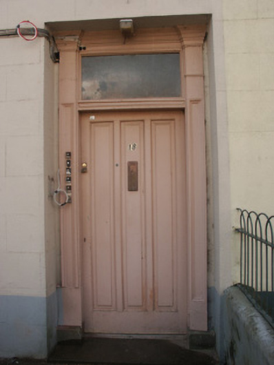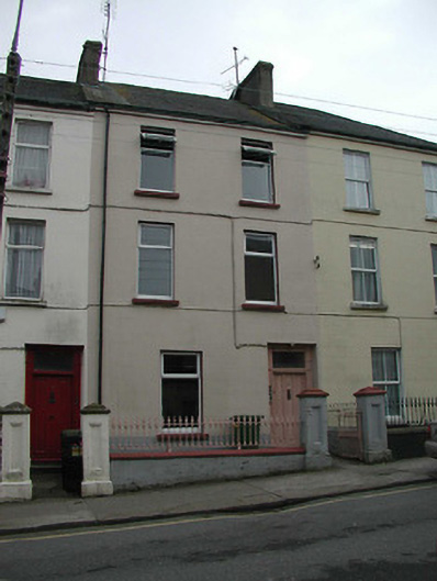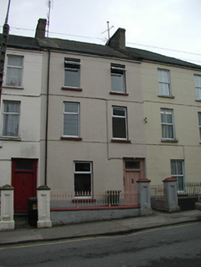 Terraced two-bay three-storey house, built 1876. Refenestrated, post-1996. Now in use as apartments. One of a terrace of three forming part of a group of seven. Pitched slate roof with clay ridge tiles, rendered (shared) chimney stacks having profiled or stepped capping, and replacement uPVC rainwater goods on rendered eaves having iron ties. Rendered, ruled and lined walls. Square-headed window openings with cut-stone sills, and replacement uPVC casement windows, post-1996 (replacing two-over-two timber sash windows). Square-headed door opening with cut-granite step, timber panelled (hollow) pilaster doorcase on cut-granite padstones, and timber panelled door having overlight. Interior retaining timber panelled reveals or shutters to some window openings. Set back from line of street with rendered plinth having cut-granite coping supporting iron railings incorporating cast-iron finials, rendered panelled piers having carved cut-granite capping, and iron gate incorporating cast-iron finials [VO].