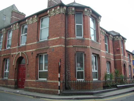 Attached five-bay two-storey office building, dated 1894, on an L-shaped plan; three-bay two-storey side (east) elevation with single-bay two-storey advanced end bay (north). Refenestrated, ----. Closed, 2004. Disused, 2005. Undergoing renovation, 2006. Hipped slate roof on an L-shaped plan, trefoil-perforated crested terracotta ridge tiles with terracotta finials to apexes, red brick English Garden Walls bond chimney stacks having yellow brick header bond corbelled stepped capping supporting terracotta or yellow terracotta pots, and replacement uPVC rainwater goods on yellow brick header bond cornice having yellow brick header bond consoles. Red brick Flemish bond walls with yellow brick header bond cornice. Round-headed door opening with cut-granite step threshold, and red brick voussoirs centred on keystone with yellow brick "Cavetto" hood moulding framing timber panelled double doors having overlight. Square-headed window openings (ground floor) with cut-granite chamfered flush sills, and red brick voussoirs with yellow brick "Cavetto" hood mouldings framing replacement uPVC casement windows replacing timber casement windows. Square-headed window openings (first floor) with cut-granite chamfered flush sills, and red brick voussoirs framing replacement uPVC casement windows replacing one-over-one timber sash windows. Interior including (ground floor): vestibule retaining tessellated "quarry" tile floor; square-headed door opening into foyer with glazed timber panelled door having sidelights on panelled risers below overlight; foyer retaining carved timber surrounds to door openings framing glazed timber panelled doors; timber boarded waiting room (east) centred on "faience majolica" tiled chimneypiece, and timber boarded ceiling in carved timber frame on carved timber cornice. Street fronted on a corner site with concrete footpath to front.