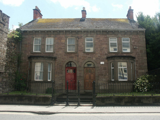Semi-detached two-bay two-storey house, built 1923, on a square plan. One of a pair. Pitched diagonal fibre-cement slate roof with ridge tiles, red brick Running bond chimney stacks having stringcourses below capping supporting terracotta or yellow terracotta tapered pots, and cast-iron rainwater goods on concrete cornice on "Cavetto"-detailed consoles on concrete stringcourse retaining cast-iron downpipe. Tuck pointed snecked "Old Red Sandstone" walls on concrete chamfered plinth with rusticated concrete quoins to corners. Round-headed door opening approached by two concrete steps, concrete block-and-start surround centred on keystone framing glazed timber panelled door having overlight. Square-headed window openings (first floor) including paired square-headed window openings (east) with concrete sills, and concrete block-and-start surrounds centred on keystones framing one-over-one timber sash windows. Set back from line of street on a slightly elevated site with cast-iron colonette piers to perimeter having ball finial-topped polygonal capping supporting wrought iron gate.