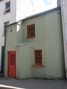 Attached two-bay two-storey house, c.1850, possibly incorporating fabric of earlier range, pre-1700, on site with single-bay two-storey lean-to advanced entrance bay to left. Pitched slate roof continuing into lean-to to entrance bay with clay or terracotta ridge tiles, replacement rendered chimney stack, and cast-iron rainwater goods on rendered eaves having iron ties. Roughcast walls over random rubble stone construction with (full-height) chamfer to corner, and rendered walls to entrance bay. Square-headed window openings with cut-stone sills, and six-over-six timber sash windows having iron bars to ground floor (square-headed aperture to entrance bay with concealed dressings, and fittings not discerned). Square-headed door opening with step or threshold, and replacement glazed timber panelled door. Street fronted with concrete footpath to front.
