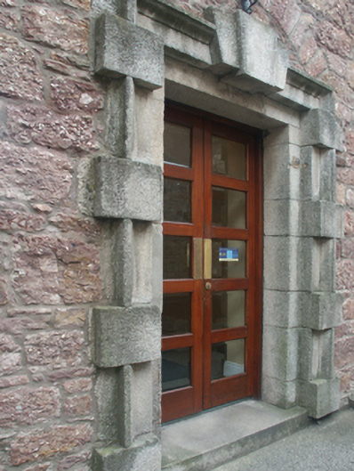 County Gaol complex including: Detached seven-bay two-storey gaol block, built 1807-9, on a symmetrical plan with single-bay two-storey pedimented projecting end bays; single-bay (two-bay deep) two-storey central return (south) on a projecting half-octagonal plan. In alternative use, 1908-18. Renovated, 1993, to accommodate continued alternative use. Hipped slate roof on a U-shaped plan with pitched (gable-fronted) slate roofs (end bays); half-octagonal slate roof (south), clay ridge tiles, and cast-iron rainwater goods on cut-granite eaves retaining cast-iron downpipes. Part repointed coursed rubble "Old Red Sandstone" walls on lichen-spotted cut-granite chamfered cushion course on plinth with cut- or hammered "Old Red Sandstone" flush quoins to corners (end bays) supporting lichen-spotted cut-granite monolithic pediments; part repointed coursed rubble "Old Red Sandstone" walls (south) with cut- or hammered "Old Red Sandstone" flush quoins to corners. Square-headed central door opening approached by "perron" of six cut-granite steps with cut-granite step threshold, and cut-granite Gibbsian surround centred on triple keystone framing replacement glazed timber double doors. Square-headed window openings (ground floor) with cut-granite sills, and cut-granite block-and-start surrounds centred on keystones framing replacement aluminium casement windows. Square-headed window openings (first floor) with cut-granite sills, and cut-granite block-and-start surrounds framing replacement aluminium casement windows. Square-headed window openings in segmental-headed recesses (end bays) with cut-granite sills, and cut-granite monolithic surrounds framing replacement aluminium casement windows. Lunette window openings (first floor) with cut-granite sills, and block-and-start surrounds centred on keystones framing cast-iron bars. Square-headed central window openings (south) with cut-granite sills, and cut-granite block-and-start surrounds centred on keystones framing replacement aluminium casement windows. Set in shared grounds.