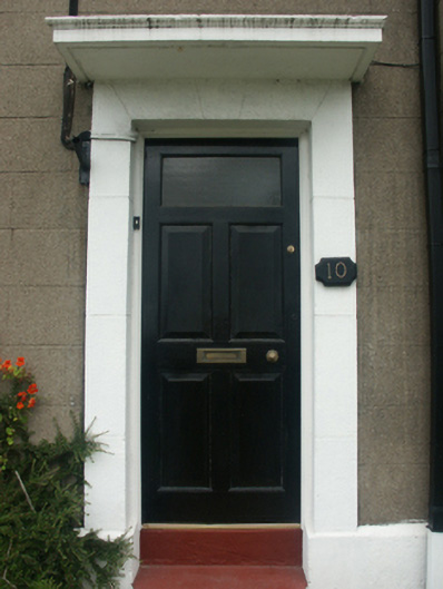 Semi-detached three-bay two-storey house, built 1934, on an L-shaped plan with single-bay two-storey gabled advanced end bay; three-bay two-storey rear (west) elevation. One of a pair forming part of a group of eighteen. Hipped slate roof on an L-shaped plan with pitched (gabled) slate roof (end bay), slay ridge tiles, rendered chimney stacks having stringcourses below capping supporting terracotta pots, and cast-iron rainwater goods on rendered eaves retaining cast-iron downpipes. Rendered, ruled and lined walls (ground floor) on rendered chamfered plinth with rendered stringcourse; fine roughcast surface finish (first floor). Square-headed central door opening with two concrete steps, and rendered surround with hood moulding framing glazed timber panelled door. Square-headed window openings with concrete sills, and concealed dressings framing eight-over-eight timber sash windows. Set back from line of road with rendered piers to perimeter having shallow pyramidal capping supporting wrought iron gate.