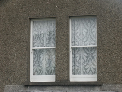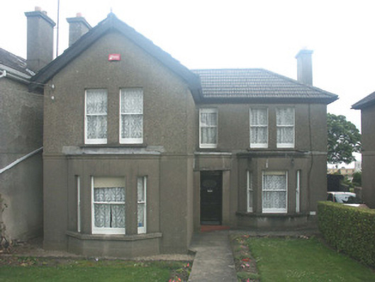 Detached three-bay two-storey house, built 1938, on an L-shaped plan with canted bay window to right ground floor, and single-bay two-storey gabled projecting bay to left having canted bay window to ground floor. One of a pair. Hipped roof (gabled to projecting bay) with profiled clay tile, clay ridge tiles, rendered chimney stacks having stepped capping supporting terracotta pots, timber bargeboards to gable having finial to apex, and aluminium rainwater goods on timber eaves. Rendered walls to ground floor with stepped stringcourse incorporating stepped cornices to bay windows supporting roughcast walls to first floor. Square-headed window openings (paired to first floor) with concrete sills forming sill courses to bay windows, and one-over-one timber sash windows. Square-headed door opening with clay-tiled step, rendered piers forming 'canted open porch' supporting concrete coping, and glazed timber panelled door having overlight. Set back from street in own grounds with roughcast boundary wall having coping, roughcast piers having stepped capping, and iron double gates [VO].