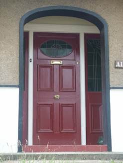Semi-detached three-bay single-storey house, built 1930, with elliptical-headed open internal porch to centre, single-bay single-storey advanced bay to right, and single-bay single-storey gabled advanced end bay to left. One of a pair. Hipped roof (gabled to end bay) with profiled clay tile, clay ridge tiles, rendered (shared) chimney stack having capping supporting terracotta pots, decorative timber bargeboards to gable on consoles having finial to apex, slightly sproketed eaves, and iron rainwater goods on slightly overhanging eaves. Rendered plinth with stringcourse supporting fine roughcast walls having rendered dressings to gable. Square-headed window openings with concrete sills, and timber casement windows incorporating leaded stained glass panels. Elliptical-headed open internal porch with rendered surround, step leading to square-headed door opening with carved timber surround framing timber mullions, and glazed timber panelled door having sidelights on panelled risers. Set back from line of street in own grounds on an elevated site with rendered boundary wall having coping supporting iron railings [VO].