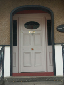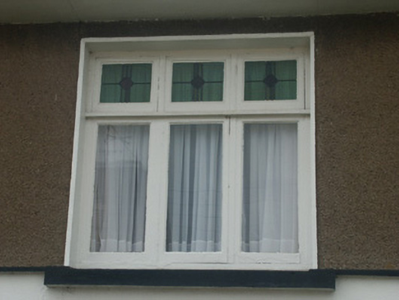 Semi-detached three-bay single-storey house, built 1930, with elliptical-headed open internal porch to centre, single-bay single-storey advanced bay to left, and single-bay single-storey gabled advanced end bay to right. One of a pair. Hipped roof (gabled to advanced end bay) with profiled clay tile, clay ridge tiles, rendered (shared) chimney stack having capping supporting terracotta pots, decorative timber bargeboards to gable on consoles having finial to apex, slightly sproketed eaves, and iron rainwater goods on slightly overhanging eaves. Rendered plinth with stringcourse supporting fine roughcast walls having rendered dressings to gable. Square-headed window openings with concrete sills, and timber casement windows incorporating leaded stained glass panels. Elliptical-headed open internal porch with rendered surround, step leading to square-headed door opening with carved timber surround framing carved timber mullions, and glazed timber panelled door having sidelights on panelled risers. Set back from line of street in own grounds on an elevated site with roughcast boundary wall having coping supporting iron railings, roughcast piers having capping, and iron gate [VO].
