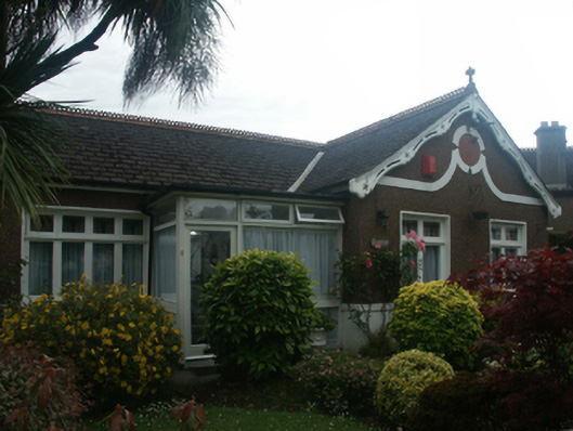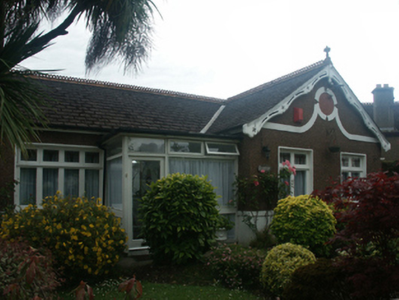 Semi-detached four-bay single-storey house, built 1932, on an L-shaped plan with two-bay single-storey gabled projecting end bay. One of a pair. Pitched red fibre-cement slate roof on an L-shaped plan with trefoil-perforated crested terracotta ridge tiles, rendered chimney stack having precast concrete capping supporting terracotta or yellow terracotta pots, quatrefoil-perforated decorative timber bargeboards to gable on timber purlins with terracotta finial to apex, and cast-iron rainwater goods on timber eaves boards on box eaves retaining cast-iron downpipes. Gritdashed roughcast walls on rendered stringcourse on rendered base. Round-headed off-central open internal porch. Square-headed door opening with timber mullions supporting timber transom, and concealed dressings framing glazed timber panelled door having sidelights on panelled risers below overlight. Square-headed window opening in quadripartite arrangement (east) with pair of square-headed window openings in bipartite arrangement (west), concrete sills, and concealed dressings framing timber casement windows. Set back from line of street in landscaped grounds with gritdashed roughcast piers to perimeter having precast concrete capping supporting iron gate.