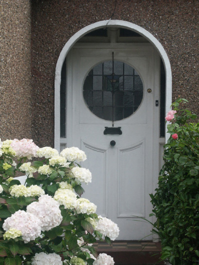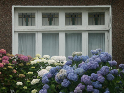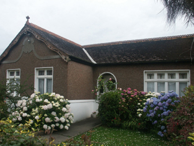 Semi-detached four-bay single-storey house, built 1932, on an L-shaped plan with two-bay single-storey gabled projecting end bay. One of a pair. Pitched red fibre-cement slate roof on an L-shaped plan with trefoil-perforated crested terracotta ridge tiles, rendered chimney stack having precast concrete capping supporting terracotta or yellow terracotta pots, quatrefoil-perforated decorative timber bargeboards to gable on timber purlins with terracotta finial to apex, and cast-iron rainwater goods on timber eaves boards on box eaves retaining cast-iron downpipes. Gritdashed roughcast walls on rendered stringcourse on rendered base. Round-headed off-central open internal porch with rendered surround. Square-headed door opening with timber mullions supporting timber transom, and concealed dressings framing glazed timber panelled door having sidelights on panelled risers below overlight. Pair of square-headed window openings in bipartite arrangement (east) with square-headed window opening in quadripartite arrangement (west), concrete sills, and concealed dressings framing timber casement windows. Set back from line of street in landscaped grounds with gritdashed roughcast piers to perimeter having precast concrete capping supporting iron gate.