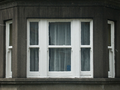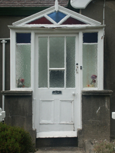 Semi-detached three-bay single-storey house, built 1933, on an L-shaped plan centred on single-bay single-storey gabled projecting glazed porch with single-bay single-storey gabled advanced end bay. One of a pair. Hipped and pitched red fibre-cement slate roof with trefoil perforated crested terracotta ridge tiles, rendered chimney stacks having corbelled stepped capping supporting terracotta or yellow terracotta pots, decorative timber bargeboards to gable, and cast-iron rainwater goods on timber eaves boards retaining cast-iron downpipes. Rendered walls. Central door opening into house. Square-headed flanking window openings in tripartite arrangement with concrete sills, fluted timber mullions, and concealed dressings framing one-over-one timber sash windows having one-over-one sidelights. Set back from line of street in unkempt landscaped grounds with rendered piers to perimeter having precast concrete capping supporting wrought iron-detailed flat iron gate.