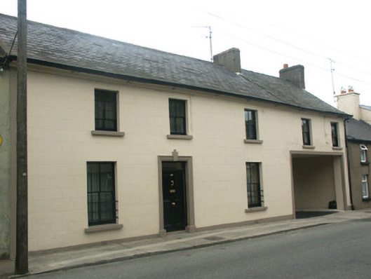 Terraced five-bay two-storey house, c.1825, originally two separate three-bay two-storey (west) and two-bay two-storey (east) houses with square-headed carriageway to right ground floor. Renovated, post-1996, with carriageway remodelled. Pitched slate roof with clay ridge tiles, rendered chimney stacks over red brick Running bond construction having stringcourses, terracotta pots, coping to original party wall, and replacement uPVC rainwater goods, post-1996, on slightly overhanging rendered eaves having iron brackets. Rendered, ruled and lined walls with (full-height) buttresses to rear (north) elevation. Square-headed window openings with cut-stone sills having iron sill guards to ground floor, and two-over-two timber sash windows. Square-headed door opening with padstones supporting moulded surround having keystone, and timber panelled door having overlight. Square-headed carriageway to right ground floor remodelled, post-1996, with rendered surround, and no fittings. Interior with timber panelled reveals or shutters to window openings. Street fronted with concrete footpath to front.