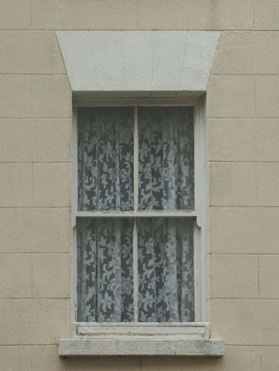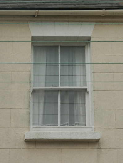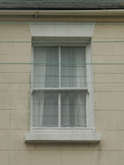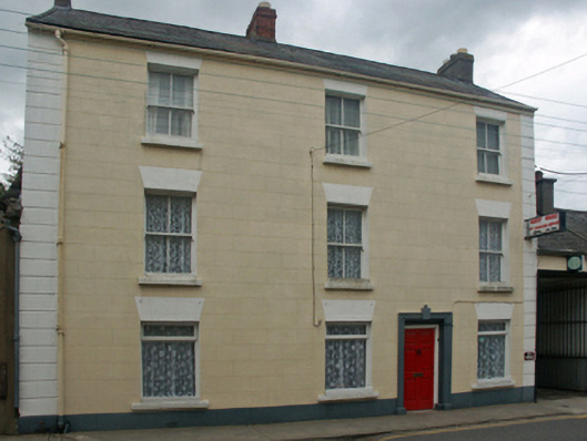 Terraced three-bay three-storey house, extant 1840, on a rectangular plan; three-bay three-storey rear (north) elevation. Part refenestrated, ----. Pitched slate roof with clay ridge tiles, concrete or rendered coping to gables with red brick Running bond (west) or rendered (east) chimney stacks to apexes, and cast-iron rainwater goods on rendered eaves retaining cast-iron downpipe. Rendered, ruled and lined walls with rusticated rendered piers to ends. Square-headed off-central door opening with threshold, and moulded surround centred on roll-topped keystone framing timber panelled door. Square-headed window openings with cut-granite sills, and concealed dressings framing two-over-two timber sash windows. Square-headed window openings to rear (north) elevation with cut-granite sills, and concealed dressings framing two-over-two timber sash windows. Street fronted with concrete footpath to front.