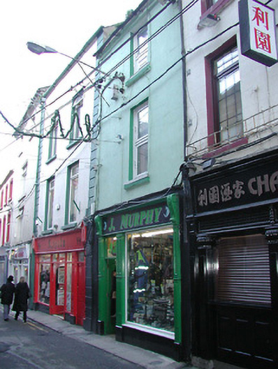 Terraced single-bay three-storey house, c.1825. Renovated, pre-1900, with shopfront inserted to ground floor. Reroofed, c.1950. Refenestrated, pre-1992. Refenestrated, post-1996. One of a group of two. Pitched roof replacement fibre-cement slate, c.1950, clay ridge tiles, rendered (shared) chimney stacks having profiled capping supporting yellow terracotta pots, and cast-iron rainwater goods on rendered stepped eaves having iron ties. Rendered, ruled and lined walls. Square-headed window openings with cut-stone sills, and replacement uPVC casement windows, post-1996. Timber shopfront, pre-1900, to ground floor with half-panelled (hollow) pilasters on reeded risers on plinths, replacement fixed-pane display window, post-2000, glazed timber door having overlight, fascia having decorative (volute) consoles, and lined moulded cornice. Street fronted with concrete footpath to front.
