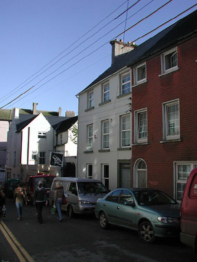 Attached two-bay three-storey house, c.1800, possibly over basement. Renovated, c.1900. Reroofed, c.1950. In use as guesthouse or offices, 1992/6. Refenestrated, post-1996. Renovated and part refenestrated, 2006, to accommodate commercial use to ground floor. Pitched roof with replacement fibre-cement slate, c.1950, clay ridge tiles, rendered chimney stack over red brick Running bond construction having red brick stepped capping supporting terracotta or yellow terracotta pots, and cast-iron rainwater goods on rendered eaves having iron ties. Rendered, ruled and lined walls. Square-headed window openings with cut-stone sills, and replacement uPVC casement windows, post-1996 (replacing one-over-one or two-over-two timber sash windows), having replacement one-over-one sash windows, 2006, to ground floor. Square-headed door opening probably originally elliptical- or round-headed with threshold, moulded rendered surround, c.1900, and replacement timber panelled door, 2006, having overlight. Interior to ground floor remodelled, 2006, retaining some cut-black or red marble chimneypieces, timber panelled shutters to some window openings, and run-moulded plasterwork cornices to some ceilings. Street fronted with concrete footpath to front.