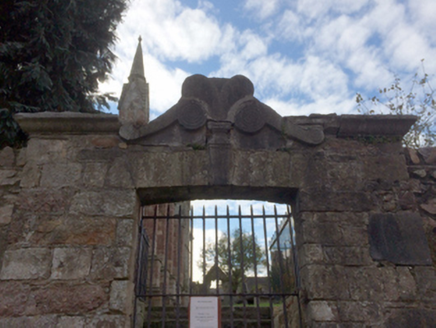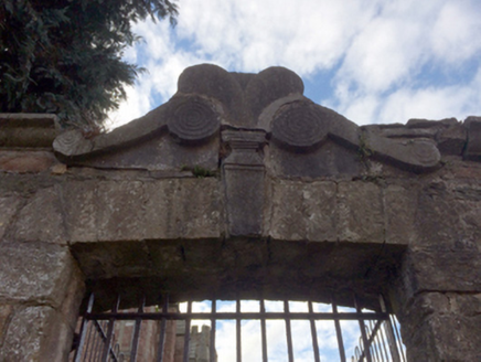 Gateway, extant 1840, on a symmetrical plan with coursed "Old Red Sandstone" piers having ogee-detailed cut-limestone coping centred on voluted keystone framing wrought iron gate. Street fronted at entrance to grounds of Saint Selskar's Church.