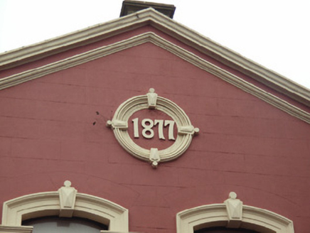 Attached four-bay (three- or four-bay deep) two-storey gable-fronted temperance coffee house, dated 1877, on a rectangular plan with shopfront to ground floor. In alternative use, 1896. Renovated, ----, to accommodate continued alternative use. Adapted to alternative use, 2005. Replacement pitched (gable-fronted) slate roof with clay ridge tiles, and cast-iron rainwater goods on rendered eaves retaining cast-iron downpipes. Rendered, ruled and lined walls on moulded cushion course on rendered plinth with ogee-detailed coping to gable on blind frieze on ogee-detailed stringcourse framing date stone ("1877") in moulded rendered surround. Rendered shopfront to ground floor with bull nose-detailed pilasters on plinths supporting lead-covered ogee-detailed cornice on blind frieze on entablature. Camber-headed window openings (first floor) with cut-granite sills, and moulded rendered archivolts centred on diamond rusticated panelled keystones framing replacement fixed-pane fittings. Square-headed window openings (side elevations) with cut-granite sills, and moulded rendered surrounds centred on panelled keystones framing replacement casement fittings. Interior including (ground floor): coffee hall retaining pair of cast-iron Corinthian colonette pillars supporting compartmentalised ceiling with decorative plasterwork cornices centred on "Acanthus"-detailed ceiling roses in decorative plasterwork frames. Street fronted with concrete footpath to front.