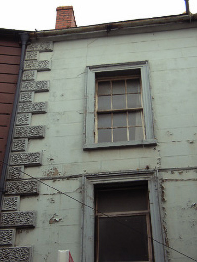 Terraced three-bay three-storey over basement house with dormer attic, c.1800. Renovated, c.1900, with rendered façade enrichments added. Renovated, pre-1993, with replacement shopfronts inserted to ground floor. Now disused to upper floors. Pitched slate roof with clay ridge tiles, red brick Running bond (shared) chimney stack, rooflights, and iron rainwater goods on rendered eaves having iron ties retaining shared cast-iron ogee hoppers and downpipes. Rendered, ruled and lined walls with rendered stringcourse to first floor, and vermiculated rendered quoins, c.1900, to ends. Square-headed window openings with cut-stone sills, moulded rendered surrounds, c.1900, and replacement one-over-one timber sash windows, c.1900, retaining one six-over-six (top floor) timber sash window (some three-over-six timber sash windows to rear (east) elevation). Replacement timber shopfronts, pre-1993, to ground floor with pilasters, fixed-pane display windows, glazed timber doors, and fascias having lined cornices. Interior with carved timber surrounds to door openings having timber panelled doors, and timber panelled shutters to window openings. Street fronted with concrete footpath to front.