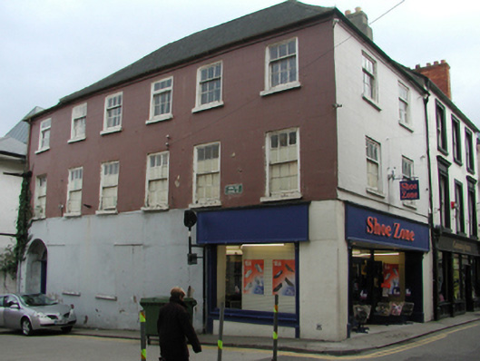 End-of-terrace two-bay (six-bay deep) three-storey over basement house, extant 1840, on a rectangular plan. Renovated, ----, with replacement shopfront inserted to ground floor. Hipped slate roof with clay ridge tiles, slightly sproketed eaves, and cast-iron rainwater goods on rendered red brick header bond stepped eaves retaining cast-iron octagonal or ogee hoppers and downpipes. Rendered, ruled and lined walls; braced roughcast wall (east) with cast-iron tie bars. Square-headed window openings (upper floors) with cut-granite sills, and concealed dressings framing three-over-six timber sash windows having part exposed sash boxes. Square-headed window openings (north) with cut-granite sills, and concealed dressings framing six-over-six (first floor) or three-over-six (top floor) timber sash windows having part exposed sash boxes. Segmental-headed door opening approached by flight of three cut-granite steps, timber doorcase with panelled pilasters, and moulded rendered surround having concave reveals framing timber panelled door having fanlight. Interior including (upper floors): carved timber surrounds to door openings framing timber panelled doors with carved timber surrounds to window openings framing timber panelled shutters. Street fronted on a corner site with concrete footpath to front having cut-granite kerbing.