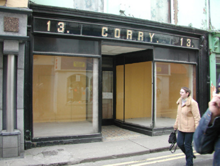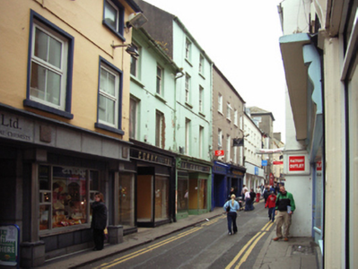 Terraced two-bay three-storey house, extant 1840, on a rectangular plan with shopfront to ground floor. Now disused. Pitched slate roof with clay ridge tiles, and cast-iron rainwater goods on rendered slate flagged eaves retaining cast-iron downpipe. Rendered wall to front (east) elevation. Timber shopfront to ground floor on a symmetrical plan centred on glazed timber panelled double doors having overlight. Square-headed window openings (upper floors) with cut-granite sills, and concealed dressings framing fixed-pane timber fittings (first floor) or one-over-one timber sash windows (top floor). Street fronted with concrete footpath to front.