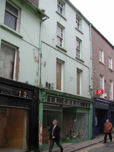 Terraced two-bay four-storey house, extant 1840, on a rectangular plan with shopfront to ground floor. Now disused. Pitched slate roof with clay ridge tiles, rendered chimney stacks having stepped capping, and cast-iron rainwater goods on rendered red brick header bond eaves retaining cast-iron octagonal or ogee hopper and downpipe. Rendered, ruled and lined wall to front (east) elevation. Timber shopfront to ground floor on a symmetrical plan centred on glazed timber panelled double doors having overlight. Square-headed window openings (upper floors) with cut-granite sills, and concealed dressings framing fixed-pane timber fittings (first floor), six-over-six (second floor) or three-over-six (top floor) timber sash windows without horns. Street fronted with concrete footpath to front.