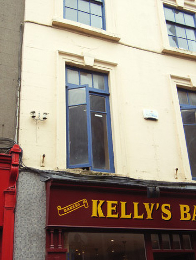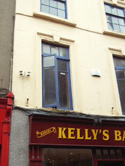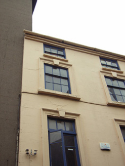 Terraced two-bay four-storey house, c.1800, possibly originally forming part of larger four-bay three-storey house. Renovated and part refenestrated, pre-1880, with rendered façade enrichments added. Renovated, post-1996, with replacement shopfront inserted to ground floor. Pitched (shared) slate roof with clay ridge tiles, chimney stack(s) not visible, rooflights, and cast-iron rainwater goods on rendered stepped eaves having iron ties. Rendered, ruled and lined walls. Square-headed window openings with cut-stone sills, moulded rendered surrounds, pre-1880, having keystones, three-over-six (second floor) and three-over-three (top floor) timber sash windows without horns having replacement timber casement windows, pre-1880, to first floor retaining overlights. Replacement timber shopfront, post-1996, to ground floor on a symmetrical plan on polished granite base with pilasters, fixed-pane display windows, glazed timber door having overlight, and fascia on paired colonettes having lined moulded cornice. Interior with timber staircase having turned timber balustrade supporting carved timber handrail. Street fronted with cobbled footpath to front.