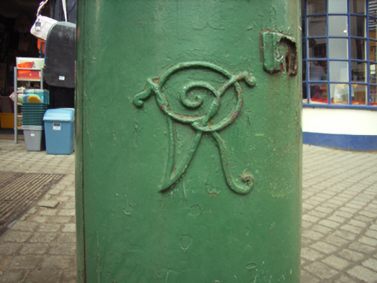 Freestanding cast-iron "pillar box" post box, between 1883-1901, with "VR [Victoria Regina]" royal cipher. Street fronted on concrete brick cobbled footpath.