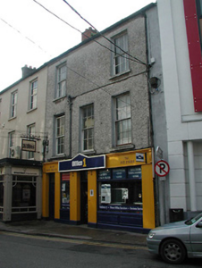 Terraced three-bay three-storey house, c.1850, originally with square-headed carriageway to left ground floor. Renovated, pre-1993, with replacement shopfront inserted to ground floor. Pitched slate roof with clay ridge tiles, red brick Running bond and rendered chimney stacks having capping supporting terracotta pots, and iron rainwater goods on rendered eaves having iron ties. Pebbledashed or roughcast walls. Square-headed window openings with cut-stone sills, and six-over-six timber sash windows. Replacement timber shopfront, pre-1993, to ground floor on chamfered plinth with fluted piers, fixed-pane display windows on panelled risers having overlights, glazed timber door having overlight, timber panelled door to house having overlight, fascia having consoles, and moulded cornice. Interior retaining run-moulded plasterwork cornices to ceilings having plasterwork ceiling roses. Street fronted with concrete footpath to front.