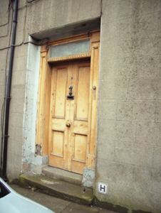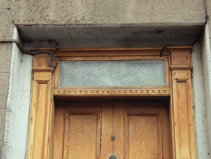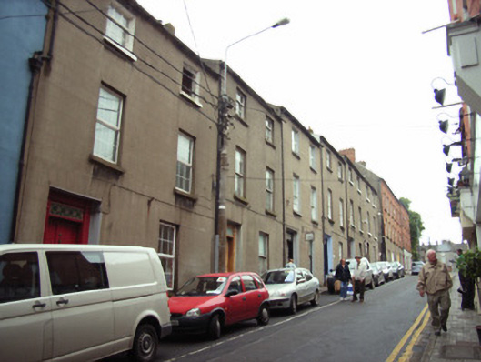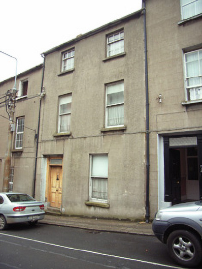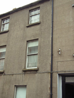 Terraced two-bay three-storey house, between 1830-40, possibly over basement. Mostly refenestrated, c.1950. One of a group of six. Pitched slate roof with clay ridge tiles, rendered (shared) chimney stacks over red brick construction having stepped capping supporting terracotta pots, and cast-iron rainwater goods on rendered eaves having iron ties. Rendered, ruled and lined walls. Square-headed window openings with cut-granite sills, and replacement one-over-one timber sash windows, c.1950, retaining three-over-six timber sash windows to top floor. Square-headed door opening in square-headed recess with two cut-granite steps, timber panelled (hollow) pilaster doorcase on cut-granite padstones, and timber panelled door having overlight. Interior with timber panelled shutters to window openings. Street fronted with concrete footpath to front [VO/SS].
