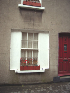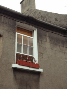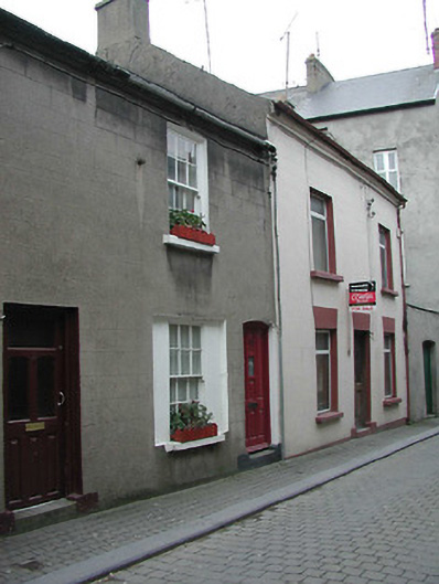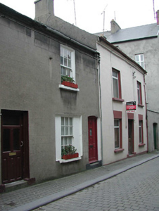 Terraced two-bay two-storey house, between 1840-55. Reroofed, c.1950. One of a group of at least two. Pitched (shared) roof with replacement fibre-cement slate, c.1950, clay ridge tiles, red brick Running bond (shared) chimney stack having stepped capping supporting yellow terracotta pots, and iron rainwater goods on rendered stepped eaves having iron ties. Rendered, ruled and lined walls. Square-headed window openings in square-headed shutter recess to ground floor with cut-stone sills, and six-over-six timber sash windows. Camber-headed door opening with step supporting padstones, and replacement glazed timber panelled door, pre-1993. Street fronted with cobbled footpath to front [VO].