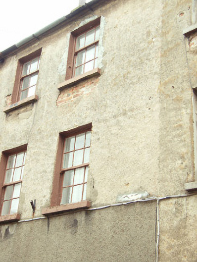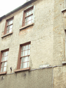 Terraced two-bay three-storey house, built 1873, possibly incorporating fabric of earlier house, pre-1840, on site. One of a group of two originally three. Pitched (shared) slate roof with clay ridge tiles, rendered (shared) chimney stacks, and cast-iron rainwater goods on rendered eaves having iron ties. Roughcast lime rendered walls over red brick construction (bond not discernible). Square-headed window openings with cut-stone sills, concealed red brick dressings, six-over-six (first floor) and three-over-six (top floor) timber sash windows having six-over-one timber sash window to ground floor. Round- or segmental-headed door opening with step, and replacement glazed timber panelled door, c.1925, having overlight. Street fronted with cobbled footpath to front [VO].