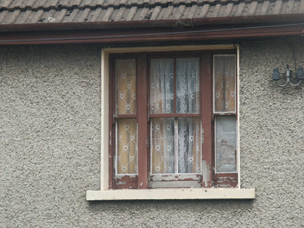 Semi-detached two-bay two-storey house, built 1952. Renovated, c.1975, with single-bay single-storey flat-roofed projecting glazed porch added to right ground floor. One of a pair forming part of a group of fourteen. Pitched and hipped (shared) concrete tile roof with concrete ridge tiles, rendered (shared) chimney stack, and aluminium rainwater goods on timber eaves (flat bitumen felt roof to porch with plastic rainwater goods on overhanging eaves). Rendered walls to ground floor on rendered plinth supporting pebbledashed or roughcast walls to first floor. Square-headed window openings in tripartite arrangement with concrete sills, and two-over-two timber sash windows having one-over-one sidelights (one square-headed window opening to ground floor with concrete sill, and fixed-pane timber window). Square-headed openings to porch with fixed-pane timber windows, and glazed timber double doors having overlight. Square-headed door opening into house with replacement glazed timber door, c.1975. Set back from street in own grounds with rendered boundary wall having rounded coping, rendered piers having profiled capping, and wrought iron (flat iron) gate [VO].
