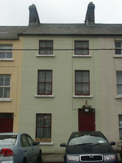 Terraced two-bay three-storey townhouse, built 1879, on a square plan; two-bay three-storey rear (south) elevation. One of a terrace of eight. Pitched slate roof with clay ridge tiles, rendered coping to gables with red brick Running bond chimney stacks to apexes having corbelled stepped capping supporting terracotta or yellow terracotta pots, and cast-iron rainwater goods on rendered eaves. Rendered, ruled and lined walls. Square-headed door opening with cut-granite step threshold, and concealed dressings framing replacement timber panelled door having overlight. Square-headed window openings with cut-granite sills, and concealed dressings framing two-over-two timber sash windows. Square fronted with concrete footpath to front.