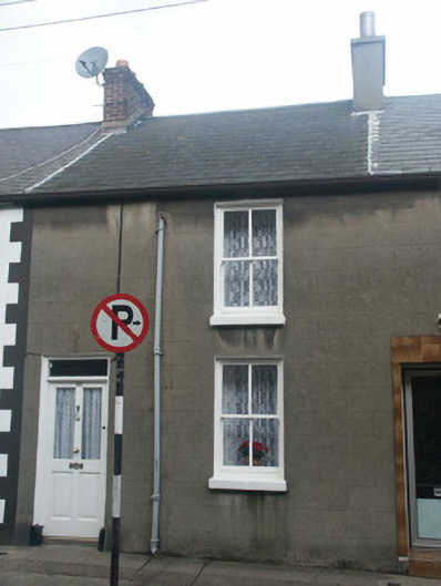 Terraced two-bay two-storey house, between 1865-70. Reroofed, pre-1992. One of a group of eleven. Pitched (shared) roof with replacement artificial slate, pre-1992, clay ridge tiles, replacement red brick Running bond and rendered (shared) chimney stacks, pre-1992, and cast-iron rainwater goods on rendered eaves having iron ties. Rendered, ruled and lined walls. Square-headed window openings with cut-granite sills, and two-over-two timber sash windows. Square-headed door opening with padstones, and glazed timber panelled door having overlight. Street fronted with concrete footpath to front [VO].
