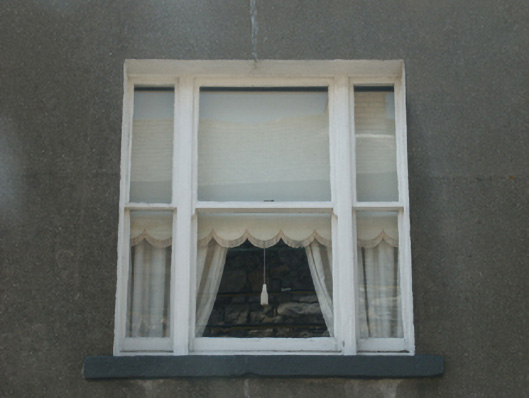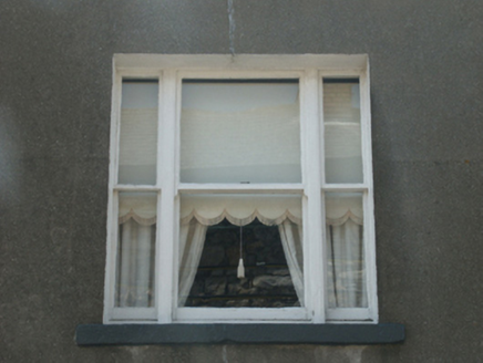 Terraced single-bay two-storey house with dormer attic, extant 1840, on a rectangular plan. Reroofed, ----. Replacement pitched artificial slate roof with ridge tiles, rendered chimney stack (south) having chamfered capping supporting terracotta pots, and uPVC rainwater goods on eaves boards on rendered eaves retaining cast-iron octagonal or ogee hopper and downpipe. Rendered, ruled and lined battered walls. Square-headed central window opening (ground floor) with cut-granite sill, and concealed dressings framing two-over-two timber sash window. Square-headed central window opening in tripartite arrangement (first floor) with cut-granite sill, timber mullions, and concealed dressings framing one-over-one timber sash window having one-over-one sidelights without horns. Street fronted with concrete footpath to front.