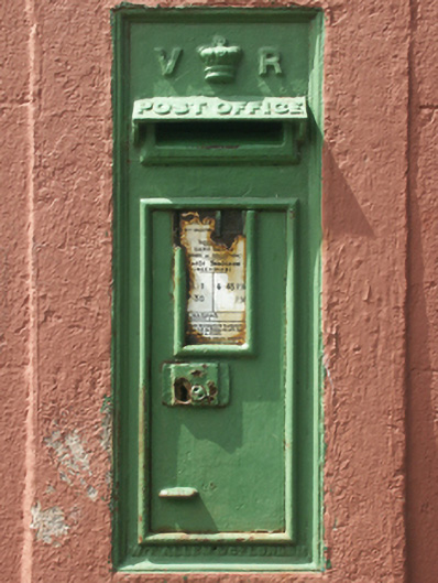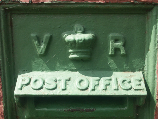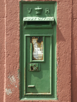 Wall-mounted cast-iron "wall box" post box, between 1883-1901; extant 1903, with "VR [Victoria Regina]" royal cipher. Set in rendered surround in rendered, ruled and lined wall.