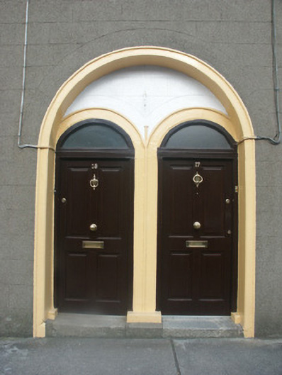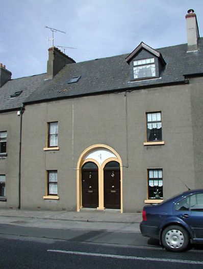 Terraced two-bay two-storey house with dormer attic, built 1899. One of a pair forming part of a group of six houses. Pitched (shared) slate roof with clay ridge tiles, rendered chimney stack having red brick stepped capping supporting yellow terracotta pots, rooflight, pre-1992, and cast-iron rainwater goods on rendered eaves having iron ties. Rendered, ruled and lined walls. Square-headed window openings with cut-stone sills, and one-over-one timber sash windows. Round-headed door opening in shared round-headed recess with cut-granite step, moulded rendered surrounds with inner surround on padstones, and replacement timber panelled door, post-1996, having overlight. Street fronted with concrete footpath to front [VO].