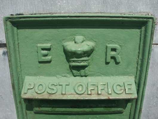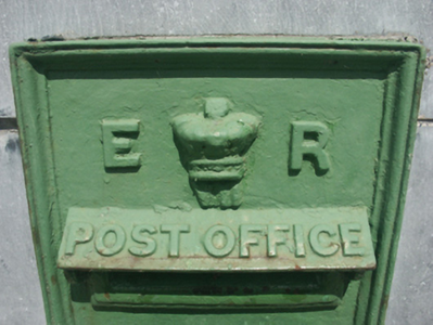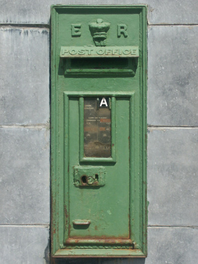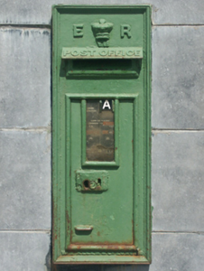 Pier-mounted cast-iron "wall box" post box, extant 1903, with "ER [Edwardus Rex] VII" royal cipher. Set in pier.