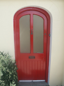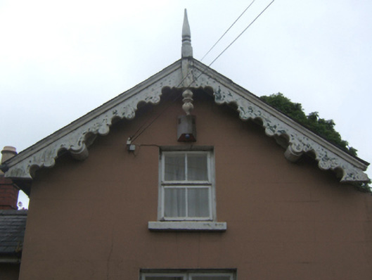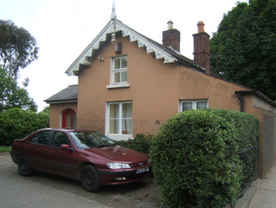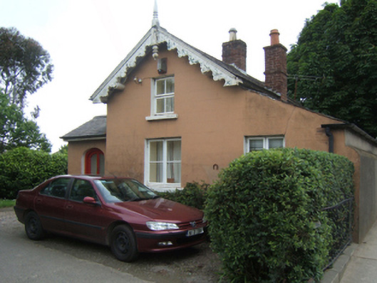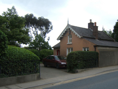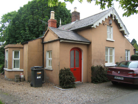 Detached single-bay (two-bay deep) single-storey gable-fronted gate lodge with half-dormer attic, extant 1898, on a T-shaped plan with single-bay single-storey recessed porch. Pitched (gabled-front) slate roof; pitched slate roof (porch), clay ridge tiles centred on red brick Running bond chimney stack having stringcourse below stepped capping supporting yellow terracotta tapered pot, decorative timber bargeboards to gables on timber purlins with timber finials to apexes, and cast-iron rainwater goods on rendered eaves retaining cast-iron downpipes. Rendered, ruled and lined walls. Elliptical-headed door opening (south) with cut-granite threshold, and concealed dressings framing glazed timber boarded door. Square-headed window openings (north) with cut-granite sills, and concealed dressings framing timber casement windows. Set back from line of street at entrance to grounds of Merrion.