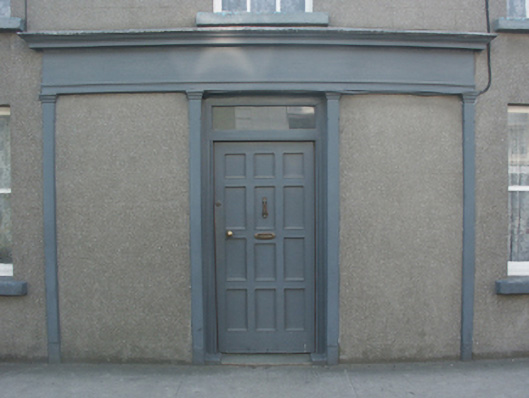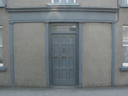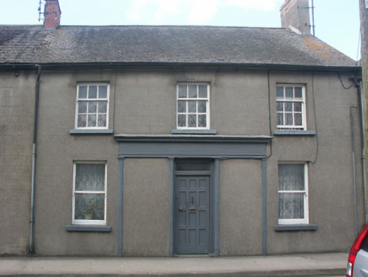 Semi-detached three-bay two-storey house, extant 1904, on a rectangular plan with shopfront to centred ground floor. Now disused. One of a pair. Pitched slate roof with clay ridge tiles, red brick Running bond chimney stacks having stepped capping supporting terracotta or yellow terracotta tapered pots, and cast-iron rainwater goods on rendered eaves retaining cast-iron downpipes. Rendered, ruled and lined walls. Timber shopfront on a symmetrical plan centred on square-headed door opening with timber panelled door having overlight. Square-headed window openings with cut-granite sills, and concealed dressings framing one-over-one (ground floor) or three-over-six (first floor) timber sash windows. Street fronted with concrete footpath to front.