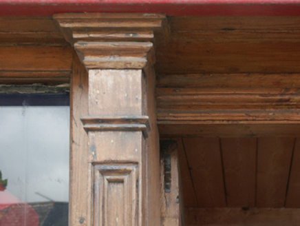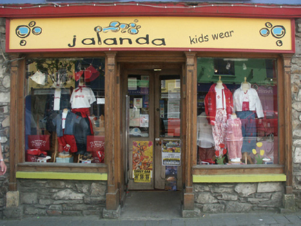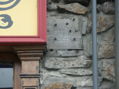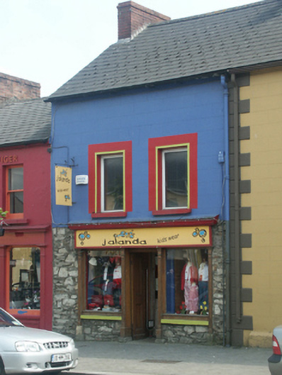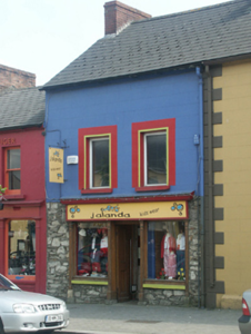 Terraced two-bay two-storey house with half-dormer attic, extant 1840, on a square plan with shopfront to ground floor. Renovated, ----. Replacement pitched artificial slate roof with ridge tiles, red brick Running bond chimney stacks having stepped capping, and cast-iron rainwater goods on rendered eaves retaining cast-iron downpipe. Repointed rubble stone wall (ground floor) originally rendered, ruled and lined; rendered, ruled and lined surface finish (first floor). Timber shopfront to ground floor on a symmetrical plan centred on timber panelled doubler doors. Square-headed window openings (first floor) with concrete sills, and concealed dressings framing replacement fixed-pane uPVC windows. Street fronted with concrete brick cobbled footpath to front.