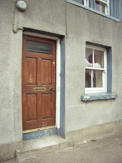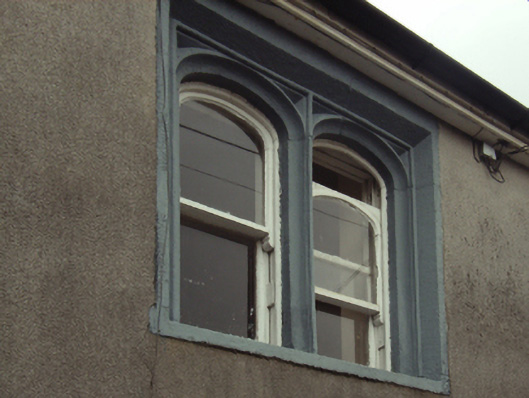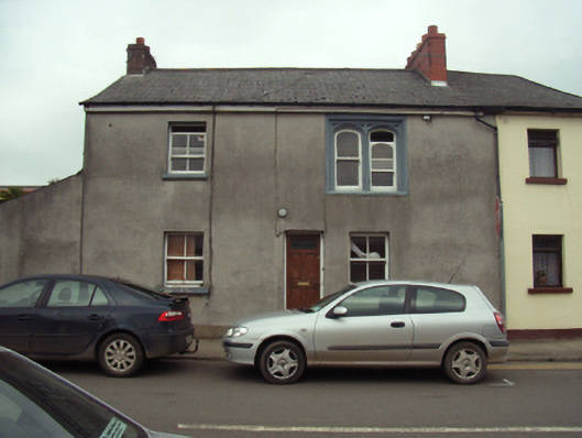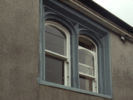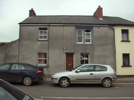 Attached two-bay two-storey house, extant 1904, on a rectangular plan originally forming part of larger three-bay two-storey composition. Subdivided, ----, producing present composition. Now disused. Pitched fibre-cement slate roof with clay ridge tiles, rendered (west) or red brick Running bond (east) chimney stacks having stepped capping supporting terracotta pots, and cast-iron rainwater goods on timber box eaves retaining cast-iron downpipe. Rendered wall to front (south) elevation on rendered plinth; roughcast surface finish (remainder). Square-headed central door opening with concrete step threshold, and concealed dressings framing replacement glazed timber panelled door. Elliptical-headed window opening in bipartite arrangement (first floor) with flush surround having chamfered reveals framing one-over-one timber sash windows. Square-headed window openings with cut-granite sills, and concealed dressings framing two-over-two timber sash windows. Street fronted with concrete footpath to front.