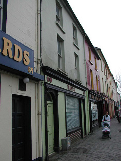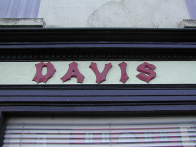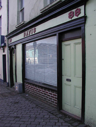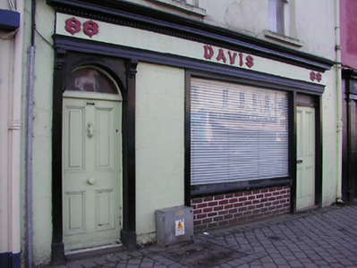 Terraced two-bay three-storey house, c.1800. Renovated and refenestrated, c.1900, with replacement shopfront inserted to ground floor. Reroofed. Now disused to ground floor. One of a group of three. Pitched (shared) roof with replacement artificial slate, clay ridge tiles, red brick Running bond (shared) chimney stacks having stepped capping with one supporting yellow terracotta octagonal pot(s), and cast-iron rainwater goods on rendered eaves having iron ties. Rendered, ruled and lined walls. Square-headed window openings with cut-stone sills, and replacement one-over-one timber sash windows, c.1900. Replacement timber shopfront, c.1900, to ground floor with pilasters, fixed-pane display window on red brick Running bond riser, timber panelled door on cut-granite step having overlight, segmental-headed door opening to house with timber panelled door on cut-granite step having overlight, entablature, fascia having raised figures/lettering, and dentilated moulded cornice. Interior with timber panelled shutters to window openings. Street fronted with concrete brick cobbled footpath to front.