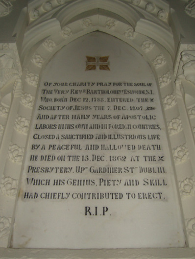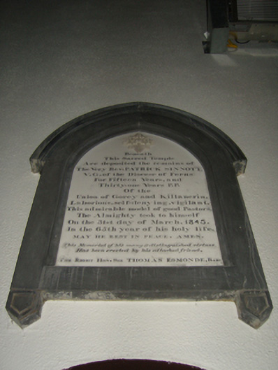 Detached nine-bay double-height Catholic church, designed 1839; built 1839-42; dedicated 1843, on a cruciform plan comprising seven-bay double-height nave opening into seven-bay single-storey lean-to side aisles; single-bay (single-bay deep) double-height transepts centred on single-bay three-stage tower to crossing with single-bay double-height apse (east) on a bowed plan. Renovated, 1973, with sanctuary reordered. Pitched slate roofs on a cruciform plan; lean-to slate roofs (side aisles) with half-conical slate roof (apse), lichen-covered ridge tiles, cut-granite coping to gables on cut-granite "Cavetto" kneelers with Cross finials to apexes, and cast-iron rainwater goods on exposed timber rafters retaining cast-iron downpipes. Part repointed tuck pointed coursed rubble stone walls with hammered granite flush quoins to corners; part repointed tuck pointed coursed rubble stone surface finish to entrance (west) front with buttress piers to corners having cut-granite "slated" coping. Round-headed window openings (clerestorey) with cut-granite surrounds having chamfered reveals framing fixed-pane fittings having stained glass margins centred on square glazing bars. Round-headed window openings (side aisles) with cut-granite surrounds having chamfered reveals framing fixed-pane fittings having stained glass margins centred on square glazing bars. Paired round-headed window openings (transepts) with "Rose Windows" to gables, cut-granite surrounds having chamfered reveals framing storm glazing over fixed-pane fittings having leaded stained glass panels. Round-headed window openings (apse) with cut-granite surrounds having chamfered reveals framing storm glazing over fixed-pane fittings having leaded stained glass panels. Round-headed door opening to entrance (west) front below date stone-embossed cut-granite coat-of-arms ("1839"), cut-granite surround having chamfered rebated reveals with hood moulding framing timber boarded double doors having overpanel. Grouped round-headed window openings with "Rose Window" to gable, cut-granite surrounds having chamfered reveals framing storm glazing over fixed-pane fittings having leaded stained glass panels. Round-headed door openings (side aisles), cut-granite surrounds having chamfered rebated reveals with hood mouldings framing timber boarded double doors having overpanels. Interior including vestibule (west) retaining terracotta tiled floor; square-headed door openings into nave with glazed timber panelled double doors; full-height interior open into roof with timber panelled choir gallery (west) on a T-shaped plan below stained glass "Trinity Window" (----),central aisle between timber pews, round-headed arcades on cut-granite drum pillars, exposed strutted Queen Post timber roof construction on cut-granite corbels with pointed-arch wind braced rafters to timber boarded ceiling on timber cornice, round-headed arches to crossing including round-headed chancel arch framing stepped dais to sanctuary (east) reordered, 1973, with pierced quatrefoil-detailed cut-veined white marble Gothic-style altar below stained glass windows (----), timber boarded wainscoting to side aisles supporting timber dado rail, Romanesque-style timber stations between frosted glass windows, exposed pointed-arch wind braced rafters to timber boarded ceilings on chevron- or saw tooth-detailed timber cornice with chevron- or saw tooth-detailed timber beams on cut-granite corbels, and Romanesque-style timber panelled confessional boxes to transepts below stained glass windows (----). Set back from street in landscaped grounds.