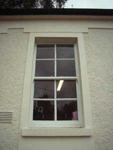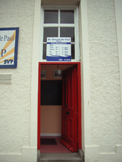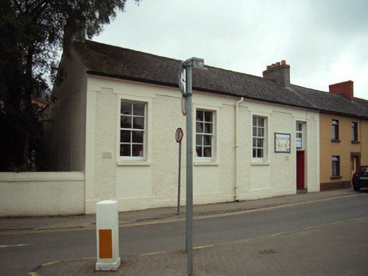 Attached four-bay single-storey national school, built 1930, on a rectangular plan. Now in alternative use. Pitched fibre-cement slate roof with clay ridge tiles centred on truncated vent, rendered chimney stacks having stepped capping supporting terracotta pots, and cast-iron rainwater goods on rendered eaves retaining cast-iron downpipes. Roughcast walls on rendered "bas-relief" plinth with rendered flush strips to corners supporting rendered "bas-relief" band to eaves. Square-headed window openings with concrete sills, and rendered "bas-relief" surrounds framing four-over-four timber sash windows. Square-headed door opening (north) with cut-granite step threshold, and rendered "bas-relief" surround framing timber panelled door having overlight. Street fronted on a corner site with concrete footpath to front.
