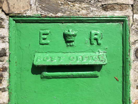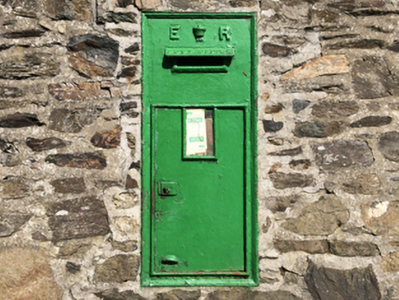Wall-mounted cast-iron "wall box" post box, between 1907-10, with "ER [Edwardus Rex]" royal cipher. Set in part repointed boundary wall.