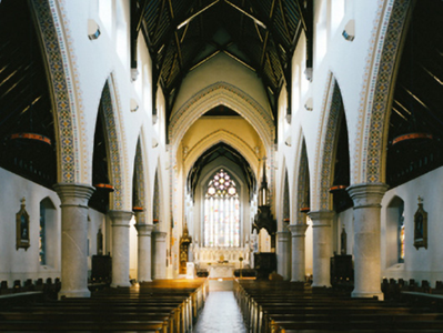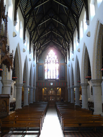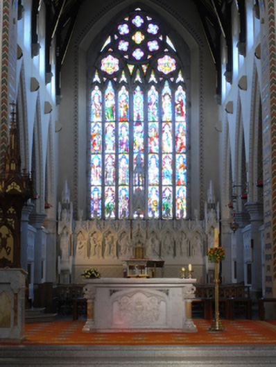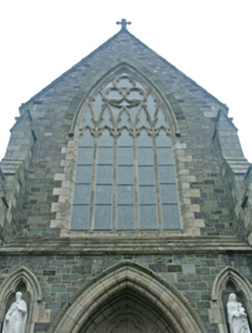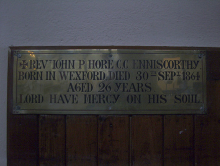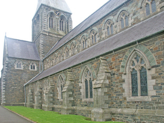 A cathedral erected to a design by Augustus Welby Northmore Pugin (1812-52) representing an important component of the ecclesiastical heritage of County Wexford with the architectural value of the composition, one built in the medieval manner around its deteriorating predecessor (1808-9), confirmed by such attributes as the cruciform plan form, aligned along a liturgically-incorrect axis; the construction in a blue-green fieldstone reclaimed from the nearby Franciscan Friary (founded 1460; dismantled 1843-7) with silver-grey granite dressings not only demonstrating good quality workmanship, but also producing a muted polychromatic palette; the "pointed" profile of the openings underpinning a "medieval" Gothic theme with the chancel defined by an elegant "North Window"; and the polygonal spire-topped tower restructured (1871-3) to a modified design by James Joseph McCarthy (1817-82) of Great Brunswick Street [Pearse Street], Dublin. Having been well maintained, the elementary form and massing survive intact together with substantial quantities of the historic or original fabric, both to the exterior and to the arcaded interior restored (1994) by Sheridan and Tierney Architects of Dublin (cf. 15703738) where contemporary joinery; dazzling stencil work; a "flèche"-topped reredos signed by Pearse and Sharpe (formed 1878) of Great Brunswick Street [Pearse Street], Dublin; a vibrant "North Window" attributable to John Hardman and Company (founded 1838) of Birmingham; wall monuments commemorating Bishop Patrick Ryan (1768-1819) and Bishop James Keating (1783-1849); and stained glass by Franz Mayer and Company (founded 1847) of Munich and London, all highlight the considerable artistic potential of the composition: meanwhile, an exposed timber roof construction pinpoints the engineering or technical dexterity of a cathedral '[forming] a remarkably striking feature and, being situated on elevated ground in the highest part of [Enniscorthy], seen to considerable advantage by the traveller as he passes from Dublin to Wexford' (Lacy 1863, 478). NOTE: Polished brass plates commemorate bishops of the diocese including Right Reverend James Keating (1783-1849) and Right Reverend Myles Murphy (1787-1856); and curates of the parish including Reverend Thomas Breen (1837-68); Reverend Patrick Kelly (1837-72); Reverend John P. Hore (1838-64); and Reverend John Busher (1841-70).