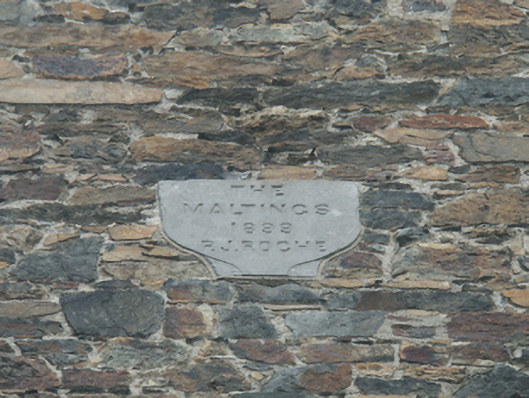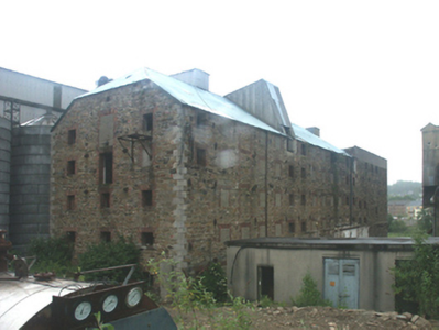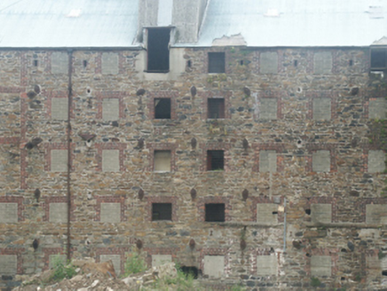 A malthouse erected by Patrick James Roche (1818-1905) of Woodville House (see 15702908) representing an important component of the late nineteenth-century industrial heritage of Enniscorthy with the architectural value of the composition confirmed by such attributes as the elongated rectilinear plan form; the construction in an unrefined local fieldstone offset by silver-grey granite or red brick dressings producing a pleasing palette; and the uniform or near-uniform proportions of the openings on each floor. A prolonged period of neglect notwithstanding, the elementary form and massing survive intact together with substantial quantities of the original fabric, both to the exterior and to the interior: however, a projected "restoration" may determine the ongoing architectural heritage status of a malthouse forming part of a self-contained ensemble (including 15603147 - 15603148) making a pleasing visual statement overlooking the River Slaney.