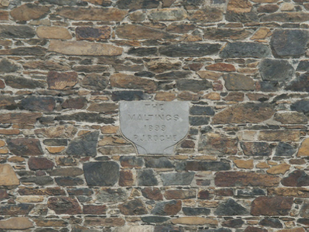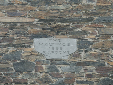 Detached three-bay (eighteen-bay deep) five-storey hipped gable-fronted malthouse, dated 1899, on a rectangular plan. Now disused. Hipped gable-fronted corrugated-iron roof on timber boarded base on collared timber construction with pressed ridges, and cast-iron rainwater goods retaining cast-iron downpipes. Part repointed coursed rubble stone walls with cut-granite flush quoins to corners centred on cast-iron "Pattress" tie plates. Square-headed central loading openings with red brick block-and-start surrounds framing timber boarded doors. Square-headed window openings with red brick block-and-start surrounds framing concrete block infill with some retaining timber boarded fittings behind wrought iron bars. Set in unkempt grounds.