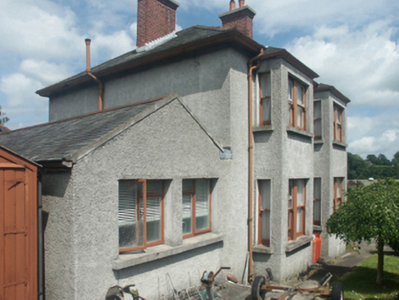 Detached two-bay (two-bay deep) two-storey house, built 1938, on a square plan. Pyramidal slate roof with terracotta ridge tiles, red brick Running bond chimney stacks having corbelled stepped capping supporting terracotta pots, and cast-iron rainwater goods on timber box eaves retaining cast-iron downpipes. Roughcast walls. Square-headed window openings in bipartite arrangement (south) with concrete sills, timber mullions, and concealed dressings framing one-over-one timber sash windows. Square-headed door opening (north) with concealed dressings framing glazed timber panelled double doors. Square-headed window opening (first floor) with concrete sill, and concealed dressings framing two-over-two timber sash windows. Set in landscaped grounds on a corner site with rendered piers to perimeter having stepped capping supporting timber gate.
