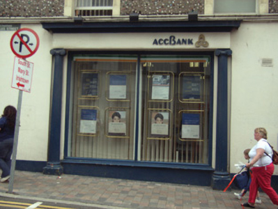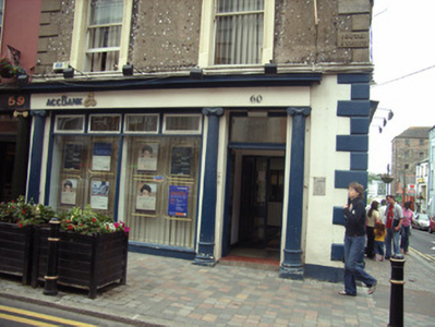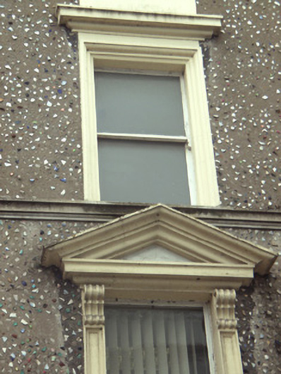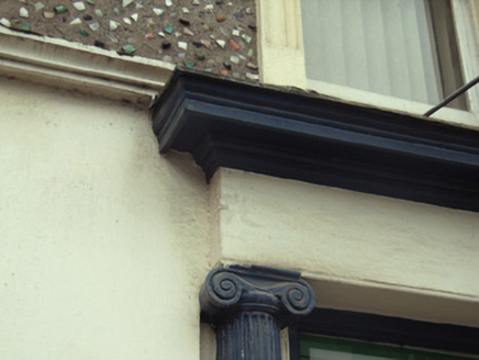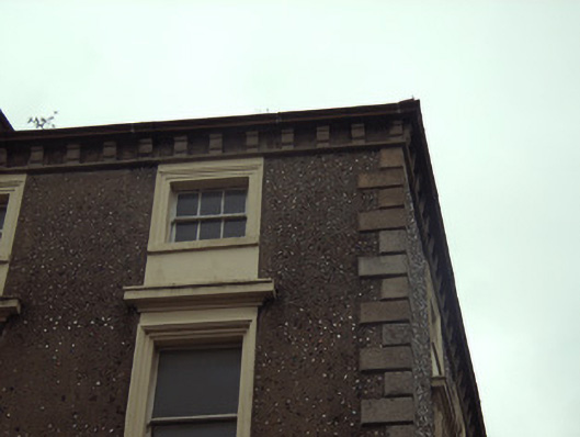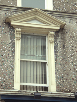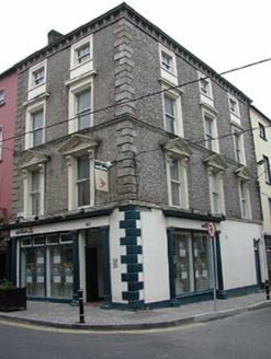 Terraced two-bay four-storey over basement house, c.1850, on a corner site possibly incorporating fabric of earlier range, pre-1840, on site with three-bay three-storey side (north) elevation, and shopfronts to ground floor. Renovated, post-1900, with rendered façade enrichments added. One of a group of three. Pitched (shared) slate roof forming hip to corner with clay ridge tiles, red or yellow brick Running bond (shared) chimney stacks having stepped capping, and cast-iron rainwater goods on rendered eaves having consoles, post-1900, on moulded stringcourse. Replacement pebble-encrusted rendered walls, post-1900, with rusticated cut-granite quoins to corners (one incorporating raised lettering), moulded stringcourse to first floor, and moulded stringcourse to second floor. Square-headed window openings with cut-stone sills forming part of sill courses, rendered dressings, post-1900, including panelled (hollow) pilaster surrounds to first floor having fluted consoles supporting triangular pediments, moulded surrounds to second floor having friezes supporting entablatures, moulded surrounds to top floor on aprons, and replacement one-over-one timber sash windows, post-1900, retaining three-over-three timber sash windows to top floor. Shopfronts to ground floor with engaged fluted Ionic columns on padstones, replacement fixed-pane timber windows having casement overlights, timber panelled double doors having overlights, and fascias having moulded cornices. Interior with timber panelled shutters to window openings. Street fronted on a corner site with concrete brick cobbled footpath to front.